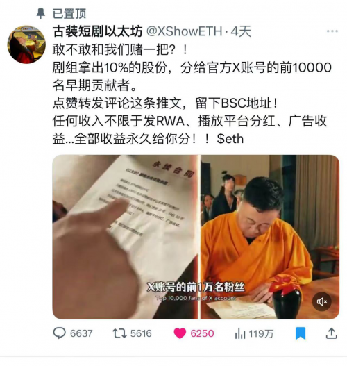 8月16日,社交网络X上一条题为《你敢和我们赌吗》的推文,直接在加密圈炸开了锅。短短三天,点击量破百万,评论区一片狂欢。大家纷纷留下自己的BSC地址,因为至此每个参加的人有了一个新的身份:《以太坊》短剧的永久云股东。