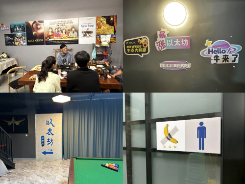 可一进门,才发现里面别有洞天:墙上全是加密货币的贴纸和娱乐赛道的规划,房间名字一个比一个江湖气,“光明顶”、“天山童姥”、“东方不败”,连厕所都没放过——男女卫生间的标识直接换成了孙宇晨的香蕉和索拉娜(Solana)的LOGO。