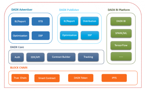 DADX全称为Decentrilized AD Exchange(中文全称:去中心化的广告交易平台,简称“达达链”),由数字广告行业的业内精英和原IBM区块链实验室专家成员共同发起,利用区块链和人工智能技术,打造去中心化人工智能广告交易平台。DadxChain旨在连接广大广告主、媒体主及开发者们,降低广告虚假流量和欺诈损失,降低广告主的流量获取成本,提高数字广告行业的结算效率,让数字广告参与各方都能获取更高的利益!