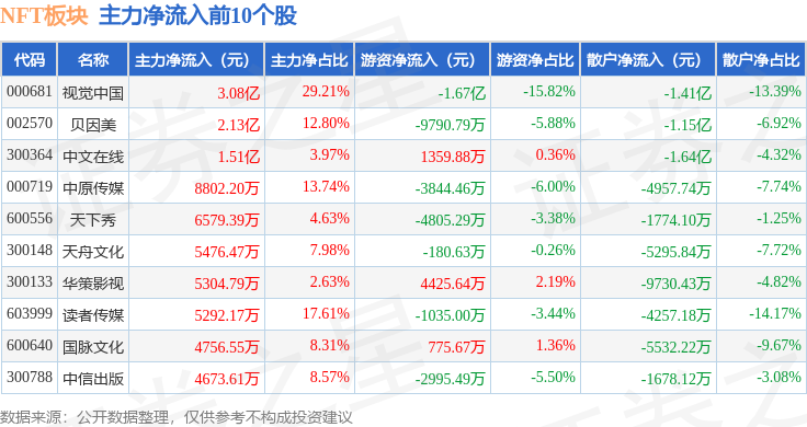 从资金流向上来看,当日NFT板块主力资金净流出10.3亿元,游资资金净流出3041.7万元,散户资金净流入10.6亿元。NFT板块个股资金流向见下表: